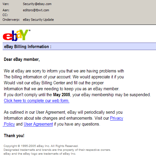 Paypal is a very attractive target for phishers to make money. At least twice a month some sort of a request from "PayPal" reaches our office to do something. This is one example how the mail looks like: