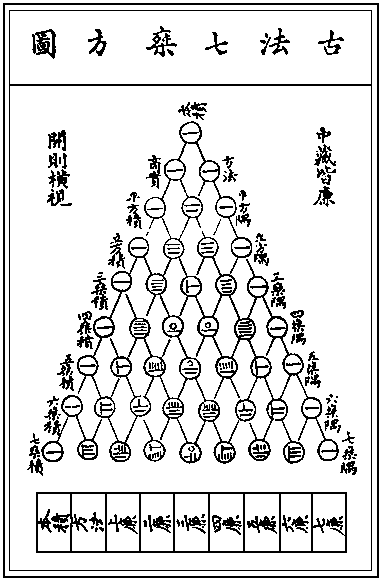 Yang also depicted the first Pascal Triangle, representing prime numbers, to depth 6. Below is an illustration from Chu Shikre to dept 8 created in 1303.(22)